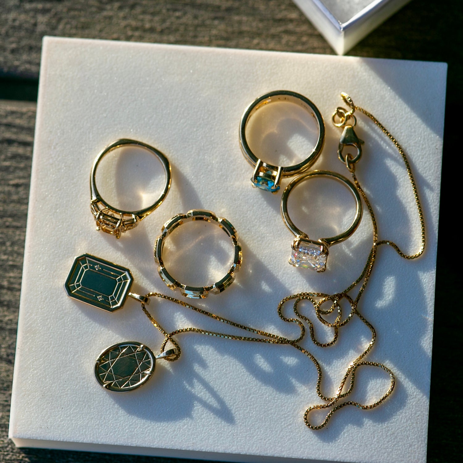 Precious metal sculpted to evoke faceted gems. Familiar forms—eternity bands, solitaires, pendants—reimagined through a conceptual lens.