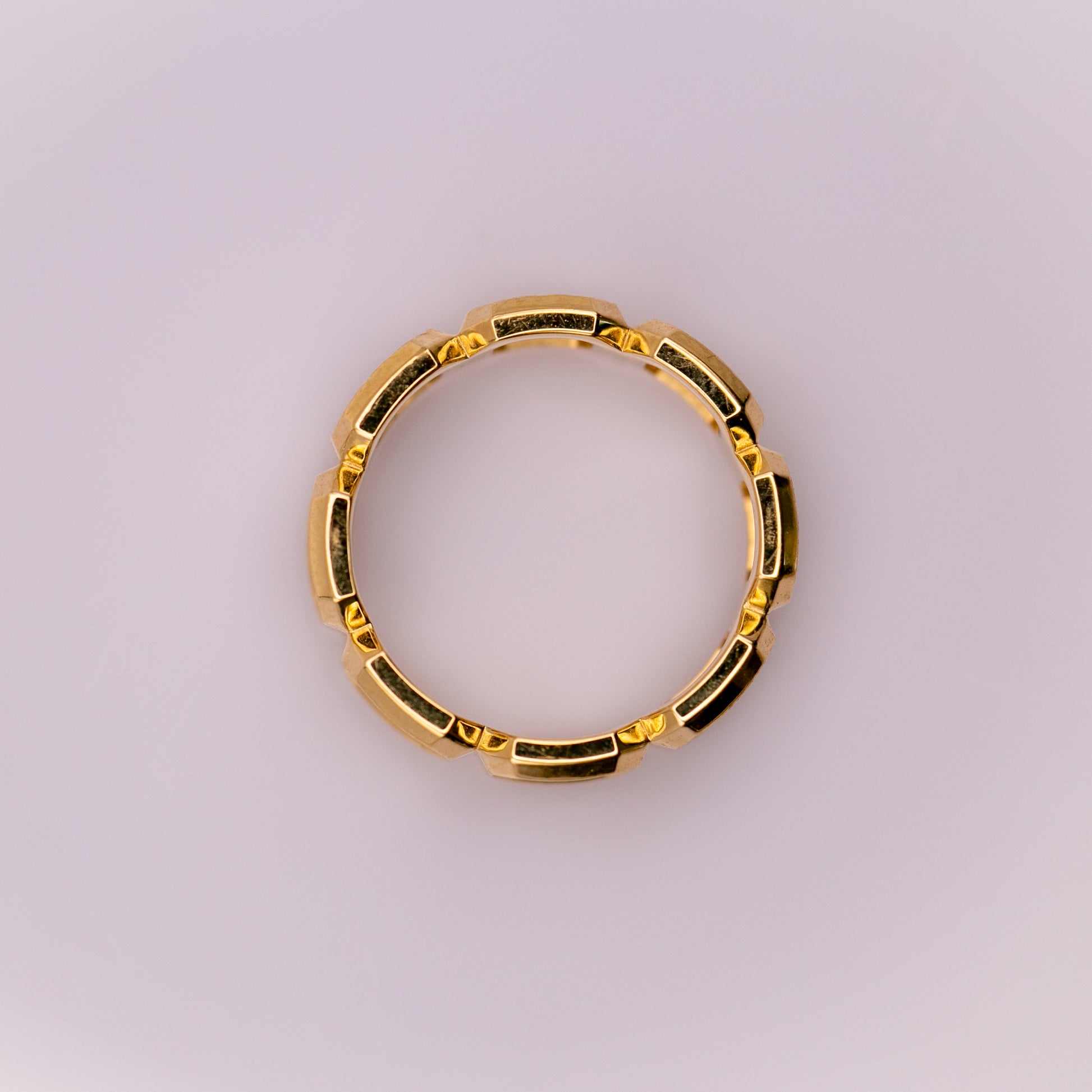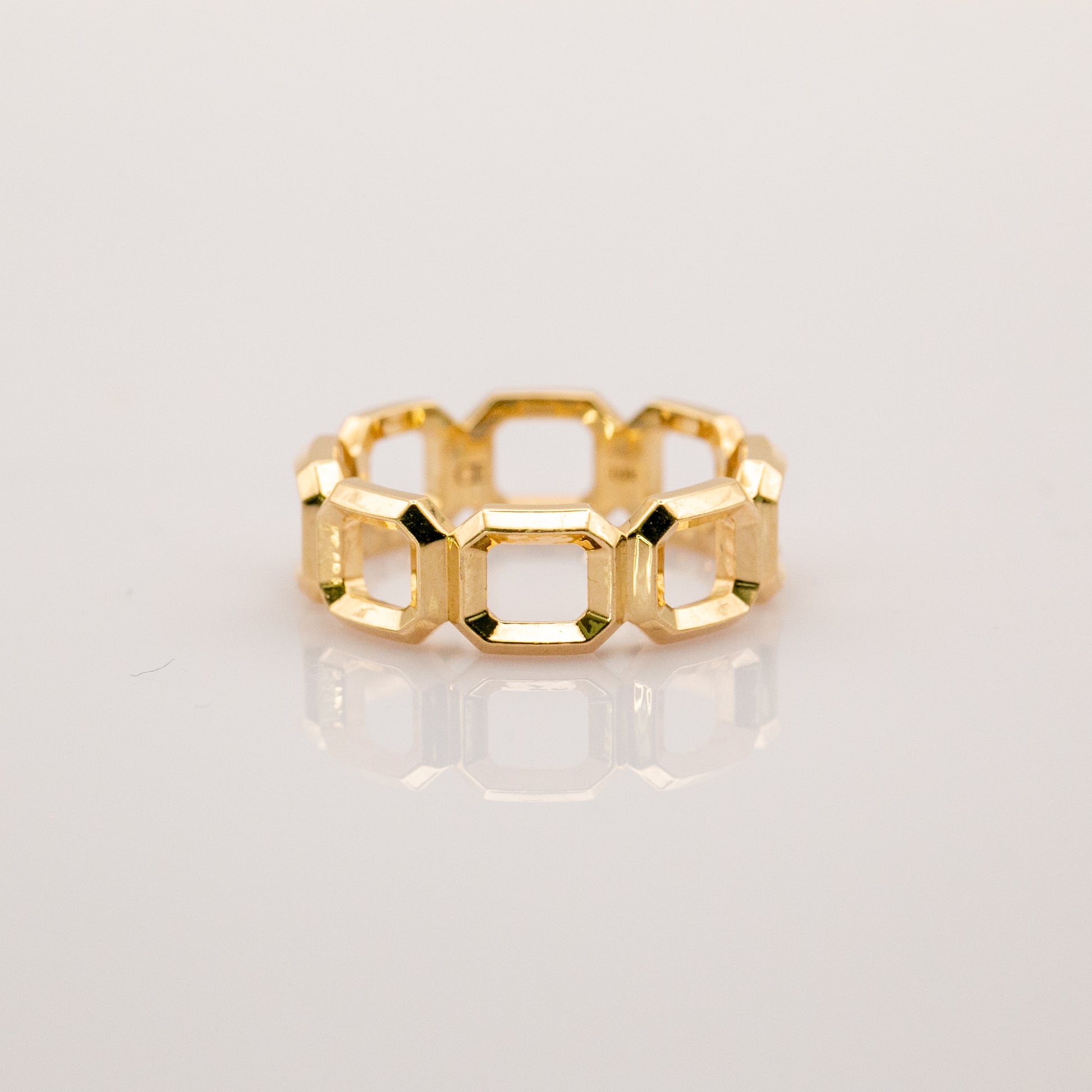 Emerald-cut silhouettes in 14k gold curve around the finger in this bold, architectural eternity band. The clean geometry gives it a modern, genderless appeal — equally at home as a wedding band, anniversary ring, or everyday statement piece.