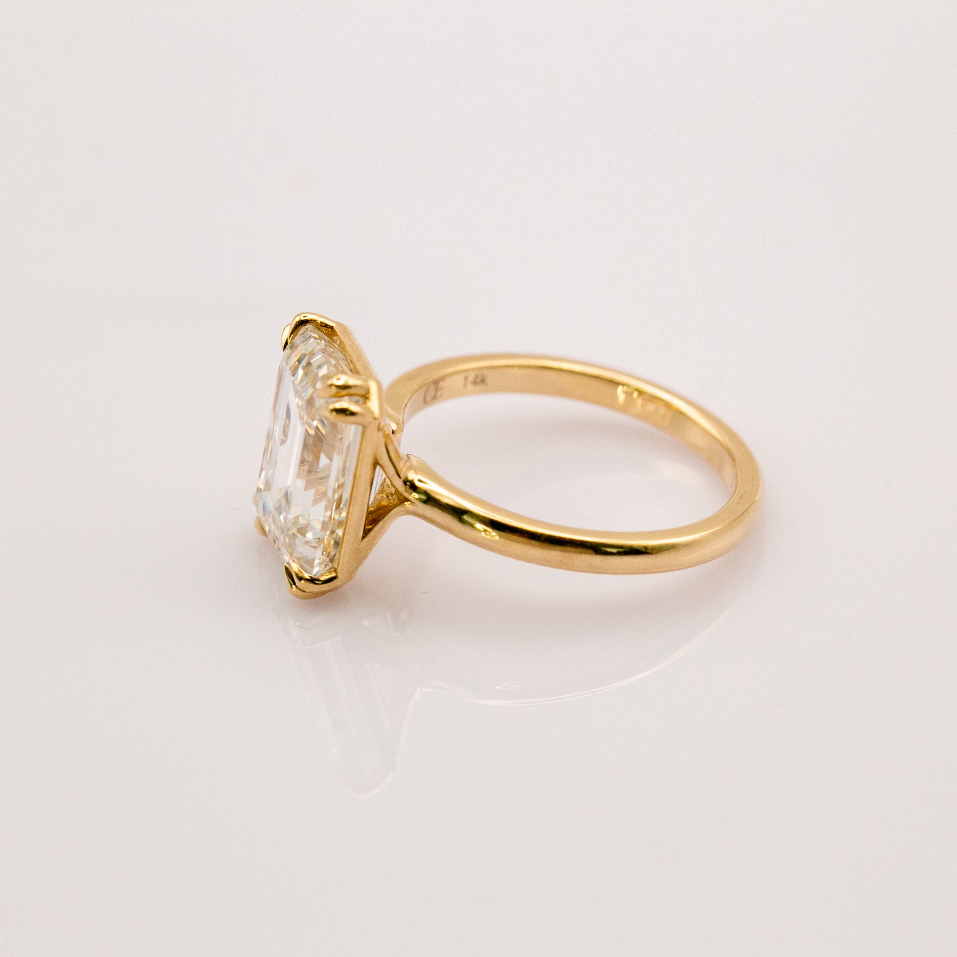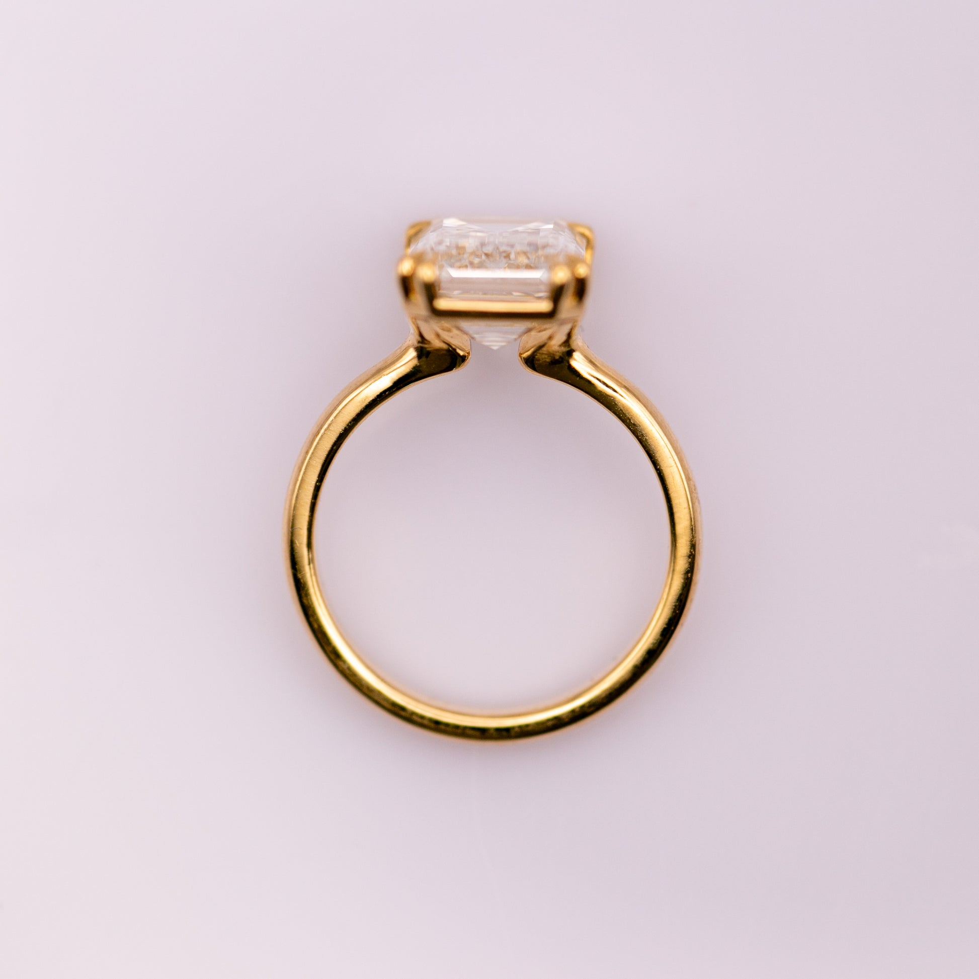 This 5.1-carat emerald-cut lab-grown diamond takes center stage with precision and presence. Its step cut facets draw the eye inward, revealing a hall-of-mirrors effect that flashes with every movement—calm, crisp, and unmistakably refined. The stone is graded G color, VS1 clarity.