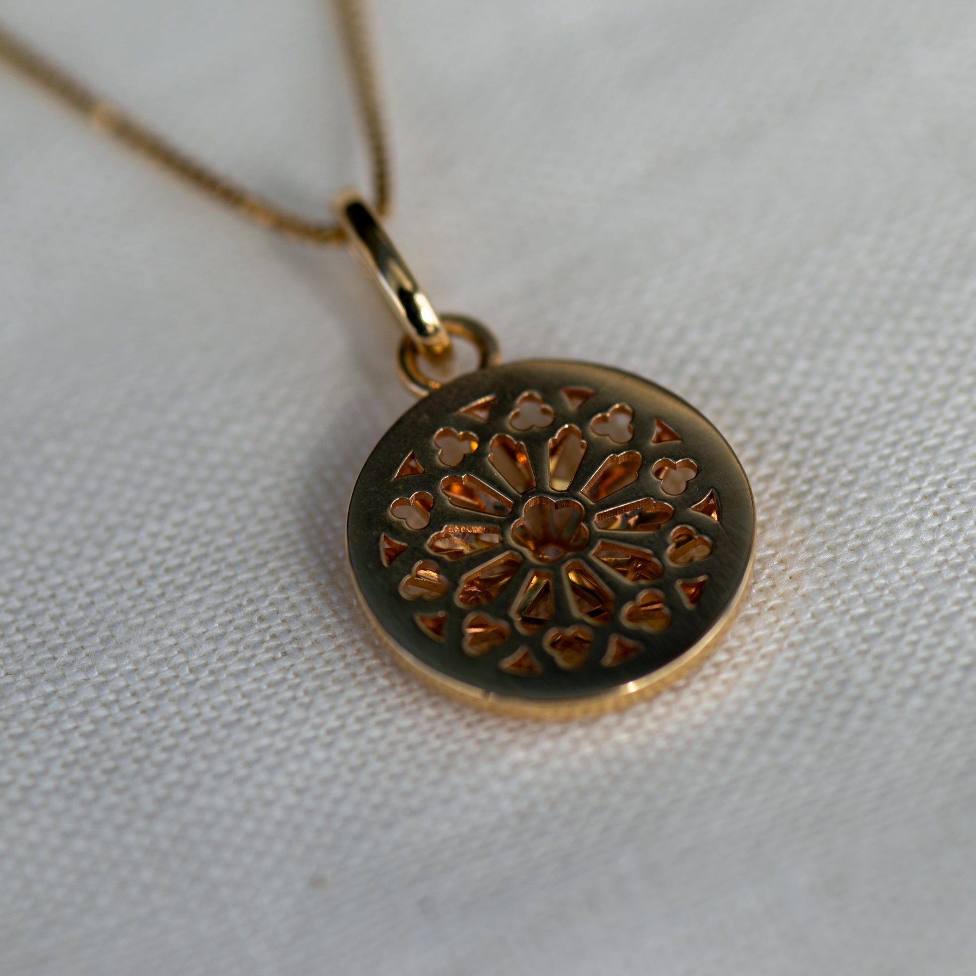 Inspired by the geometry of a rose cut gemstone and the rose window of Grace Cathedral in San Francisco, this reversible medallion brings together two intricate patterns in solid gold. The front features an openwork cage of rose cut facets, while the reverse echoes the cathedral’s stained glass window design. A large detachable bail allows the pendant to be worn on a variety of chains, from delicate cable styles to bold statement links.
